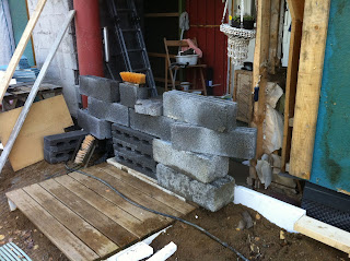 Nyt kun siinä on kunnon seinä ja ovi jatkan ennen pakkasia rakentamalla siihen kunnon kuistin - jonka katto on sivuttain sisään tuloon nähden - että lumet ei tule niskaan ja oven eteen.